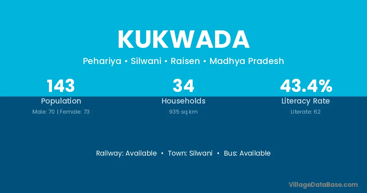 Kukwada village has a total population of 58 people, of which 29 are males and 29 are females.