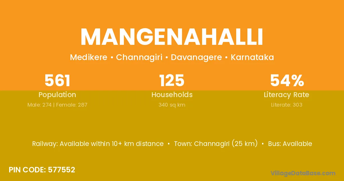 Channagiri (25 km) is the nearest town to Mangenahalli village for major economic activities and is located approximately 25 km away.