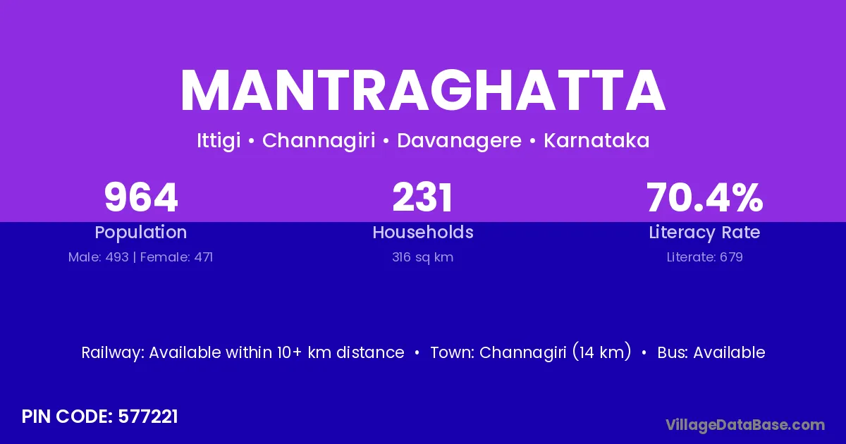 Channagiri (14 km) is the nearest town to Mantraghatta village for major economic activities and is located approximately 14 km away.