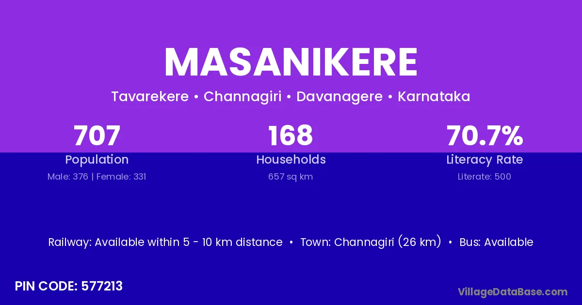 Channagiri (26 km) is the nearest town to Masanikere village for major economic activities and is located approximately 26 km away.