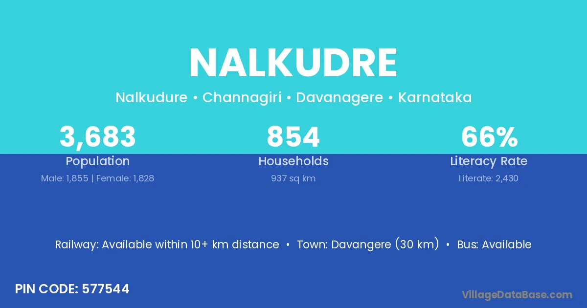 Davangere (30 km) is the nearest town to Nalkudre village for major economic activities and is located approximately 30 km away.