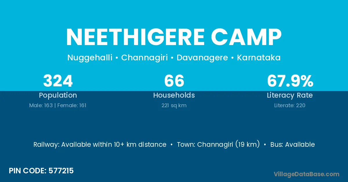 Neethigere Camp village has a total population of 324 people, of which 163 are males and 161 are females.