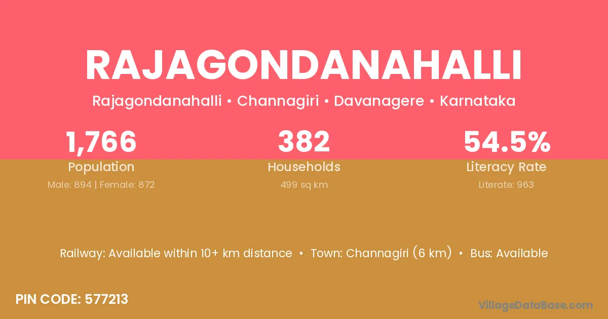 Channagiri (6 km) is the nearest town to Rajagondanahalli village for major economic activities and is located approximately 6 km away.