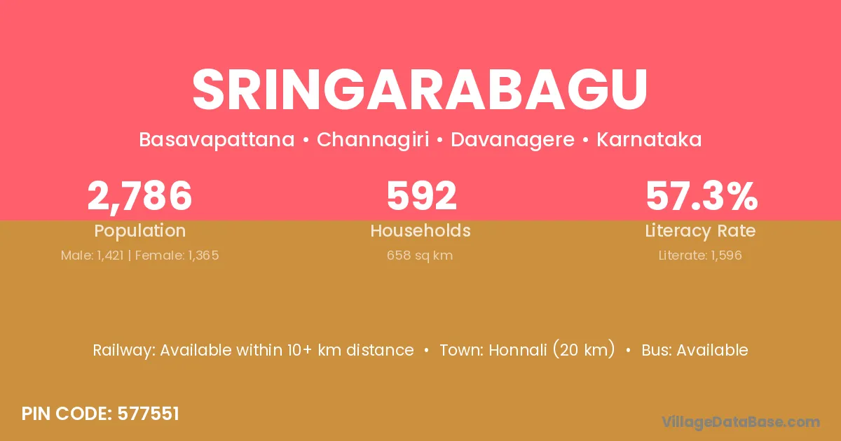 Honnali (20 km) is the nearest town to Sringarabagu village for major economic activities and is located approximately 20 km away.