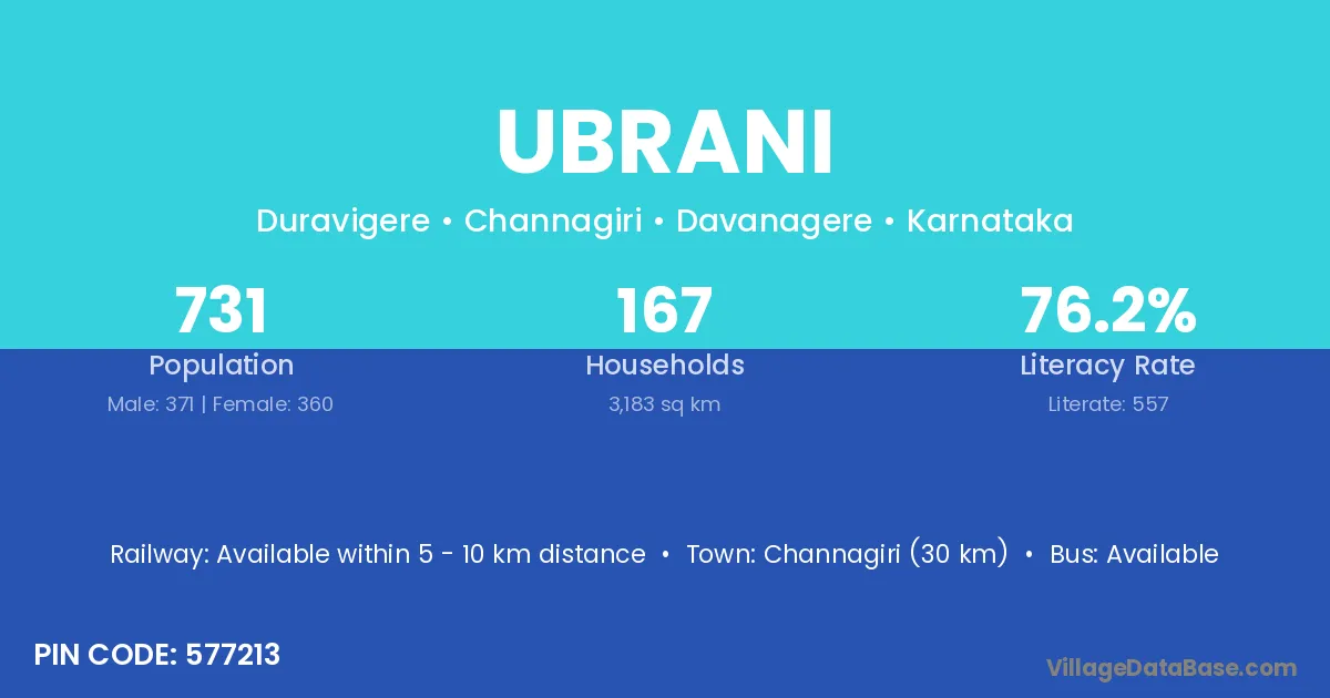 Channagiri (30 km) is the nearest town to Ubrani village for major economic activities and is located approximately 30 km away.