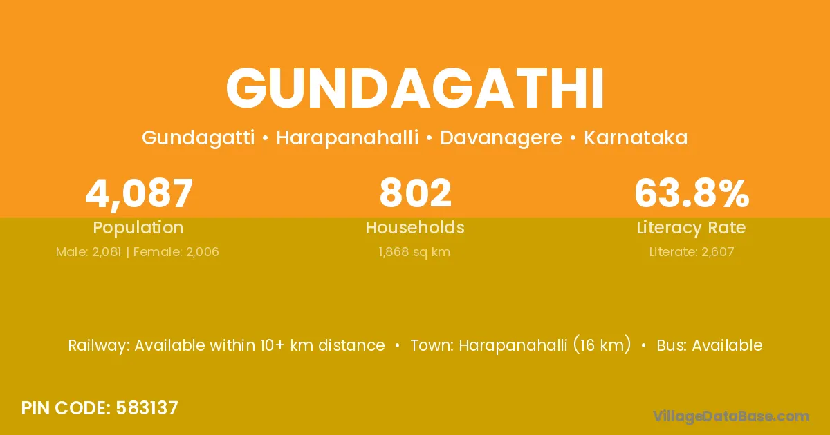 Harapanahalli (16 km) is the nearest town to Gundagathi village for major economic activities and is located approximately 16 km away.