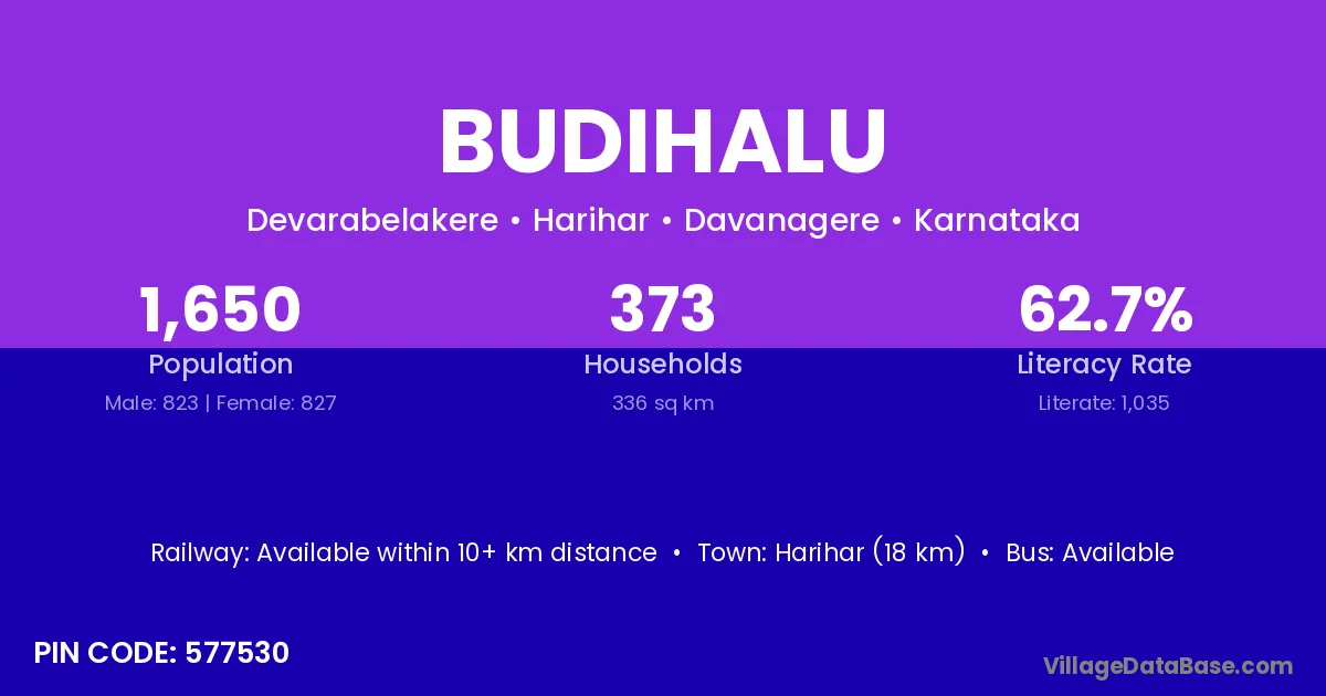 Harihar (18 km) is the nearest town to Budihalu village for major economic activities and is located approximately 18 km away.