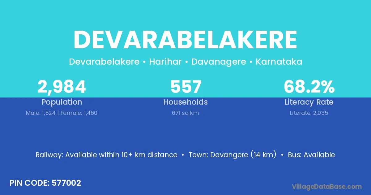 Devarabelakere village has a total population of 2,984 people, of which 1,524 are males and 1,460 are females.