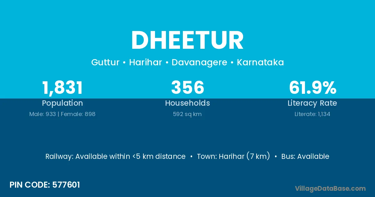 Harihar (7 km) is the nearest town to Dheetur village for major economic activities and is located approximately 7 km away.