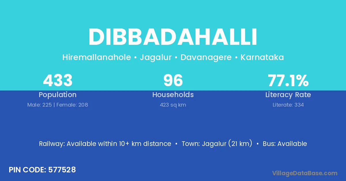 Harihar (25 km) is the nearest town to Dibbadahalli village for major economic activities and is located approximately 25 km away.