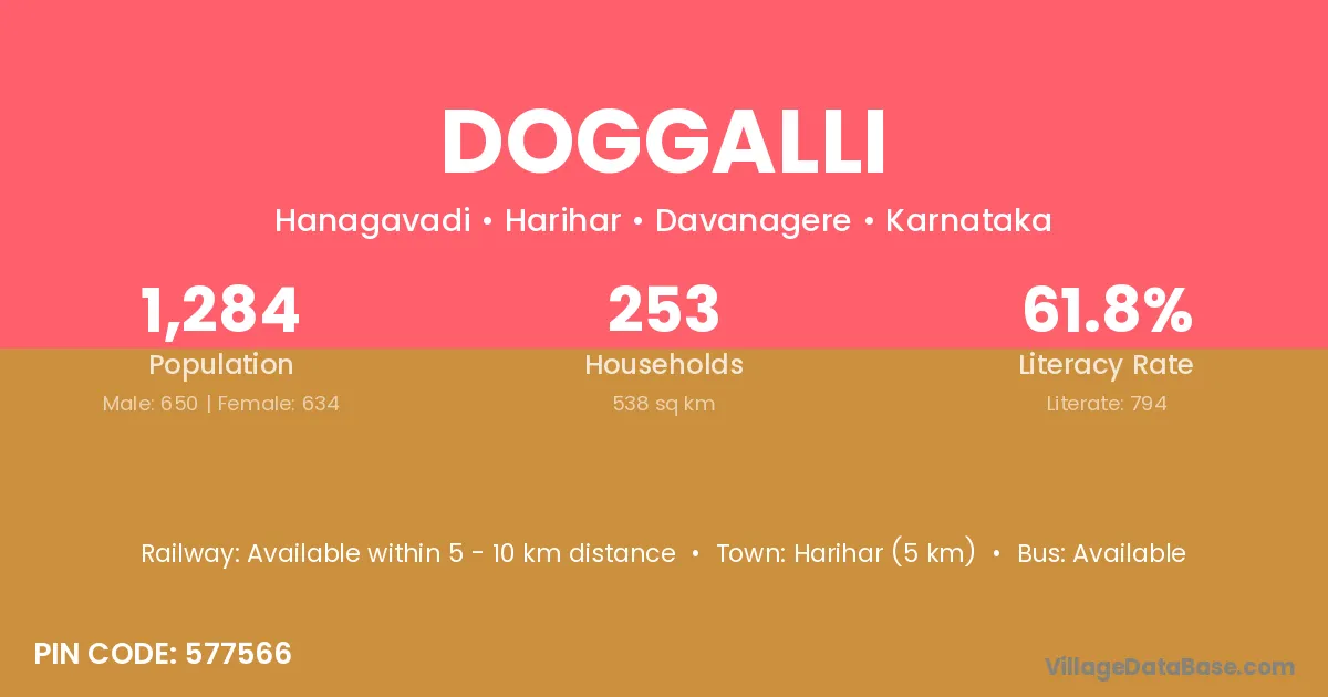 Harihar (5 km) is the nearest town to Doggalli village for major economic activities and is located approximately 5 km away.
