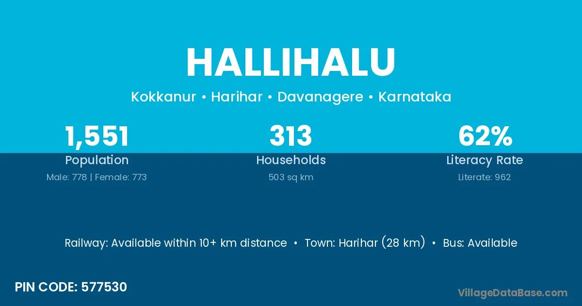 Hallihalu village has a total population of 1,551 people, of which 778 are males and 773 are females.