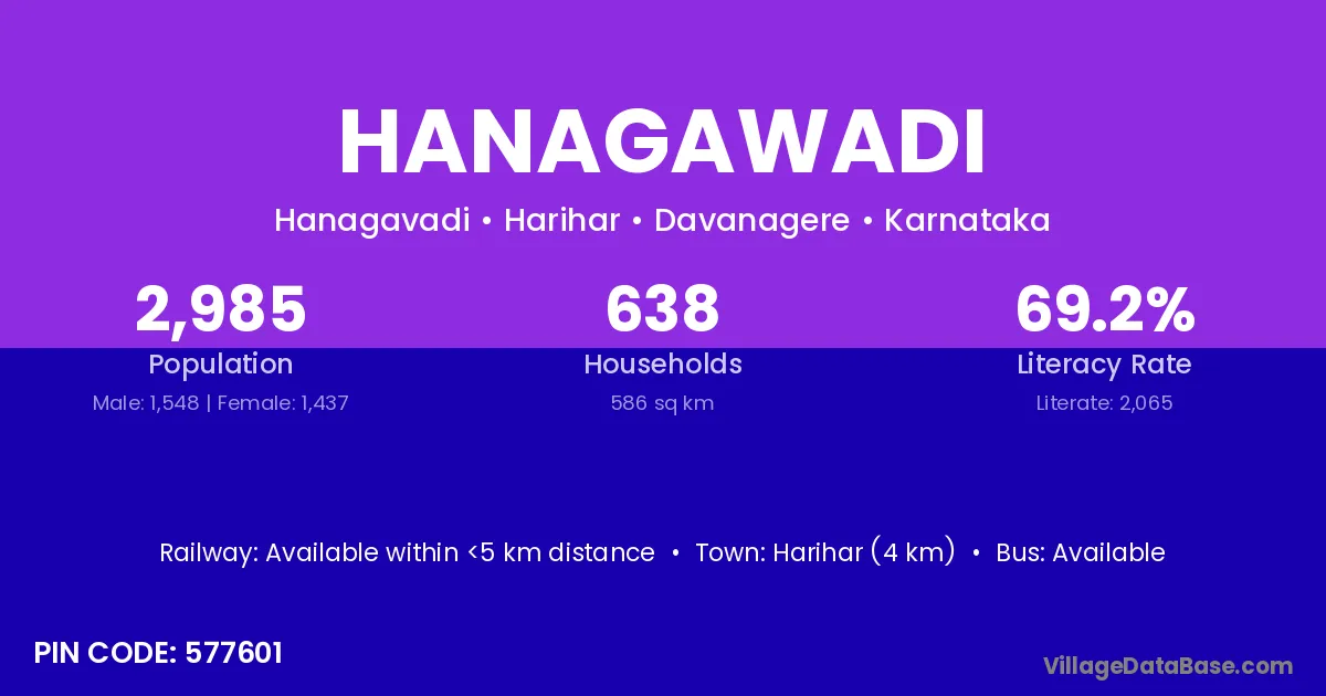 Harihar (4 km) is the nearest town to Hanagawadi village for major economic activities and is located approximately 4 km away.