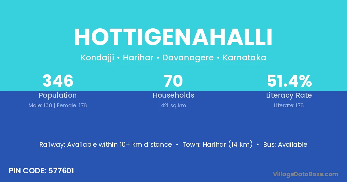 Harihar (14 km) is the nearest town to Hottigenahalli village for major economic activities and is located approximately 14 km away.