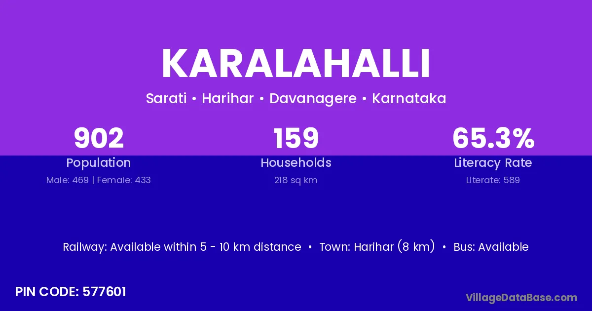 Karalahalli village has a total population of 902 people, of which 469 are males and 433 are females.