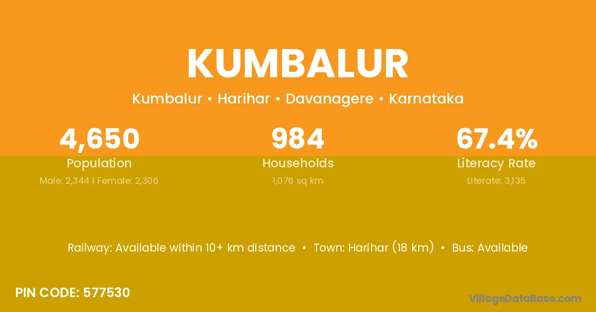 Harihar (18 km) is the nearest town to Kumbalur village for major economic activities and is located approximately 18 km away.