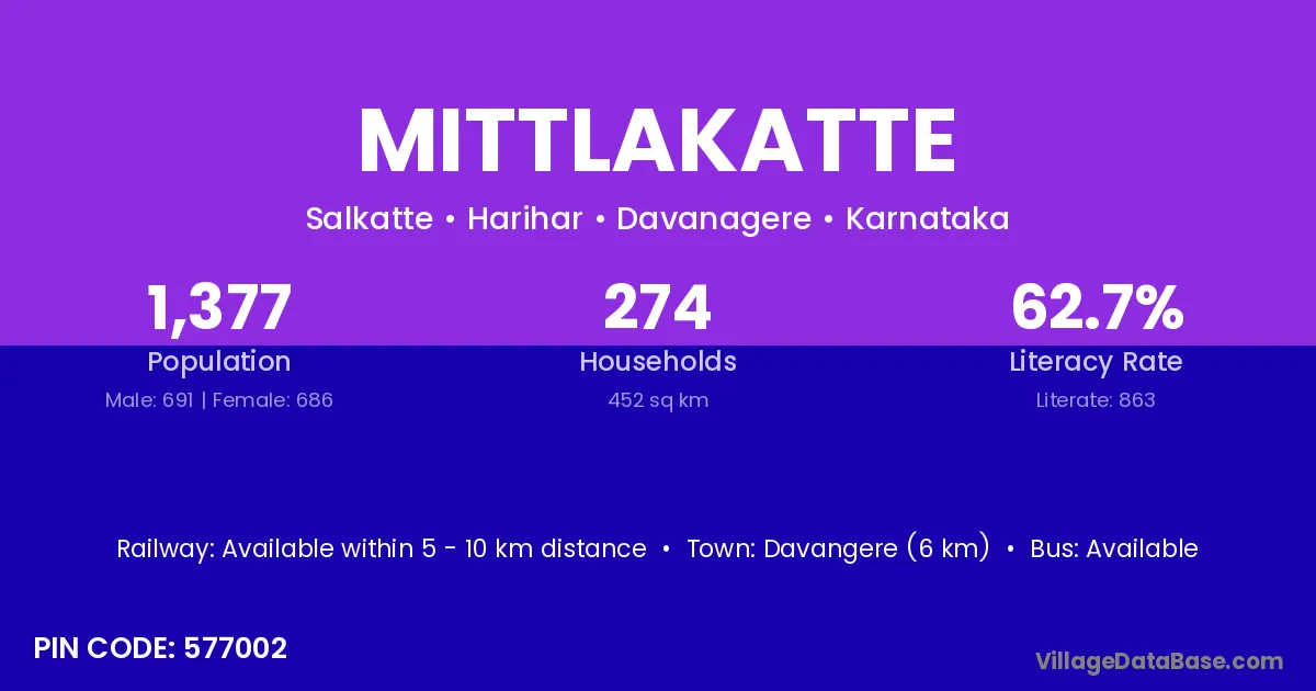 Davangere (6 km) is the nearest town to Mittlakatte village for major economic activities and is located approximately 6 km away.
