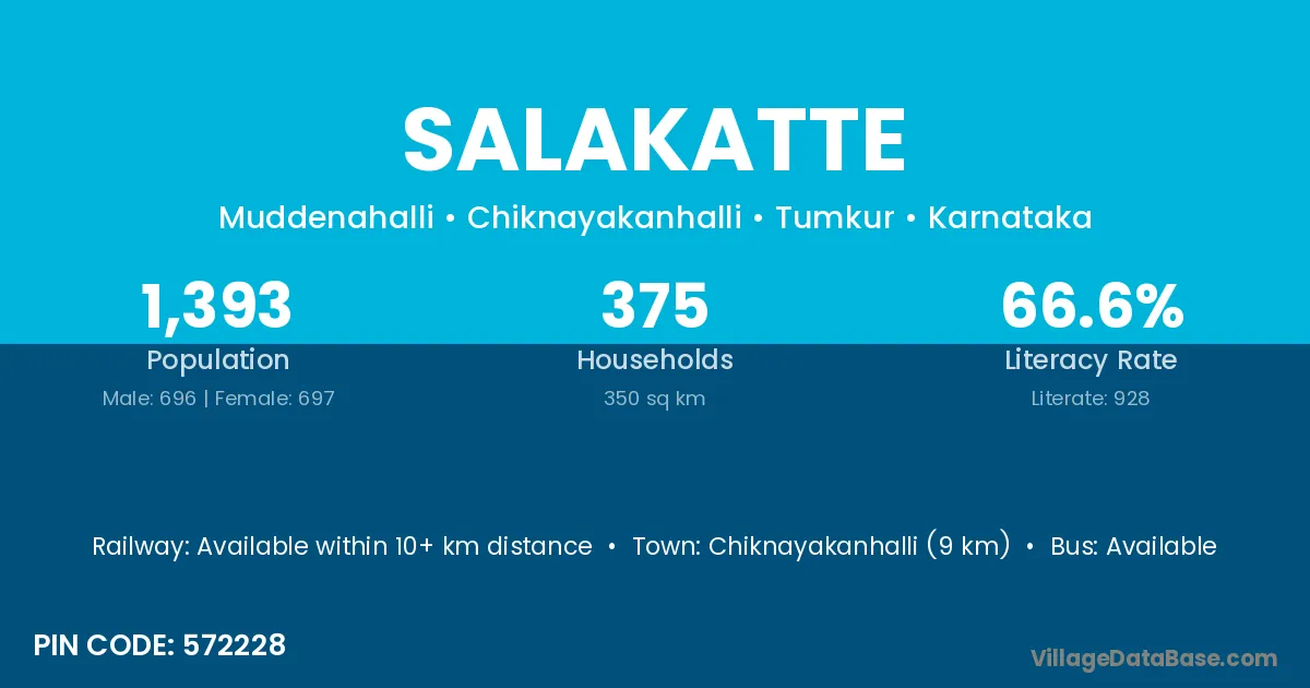 Salakatte village has a total population of 1,945 people, of which 1,006 are males and 939 are females.