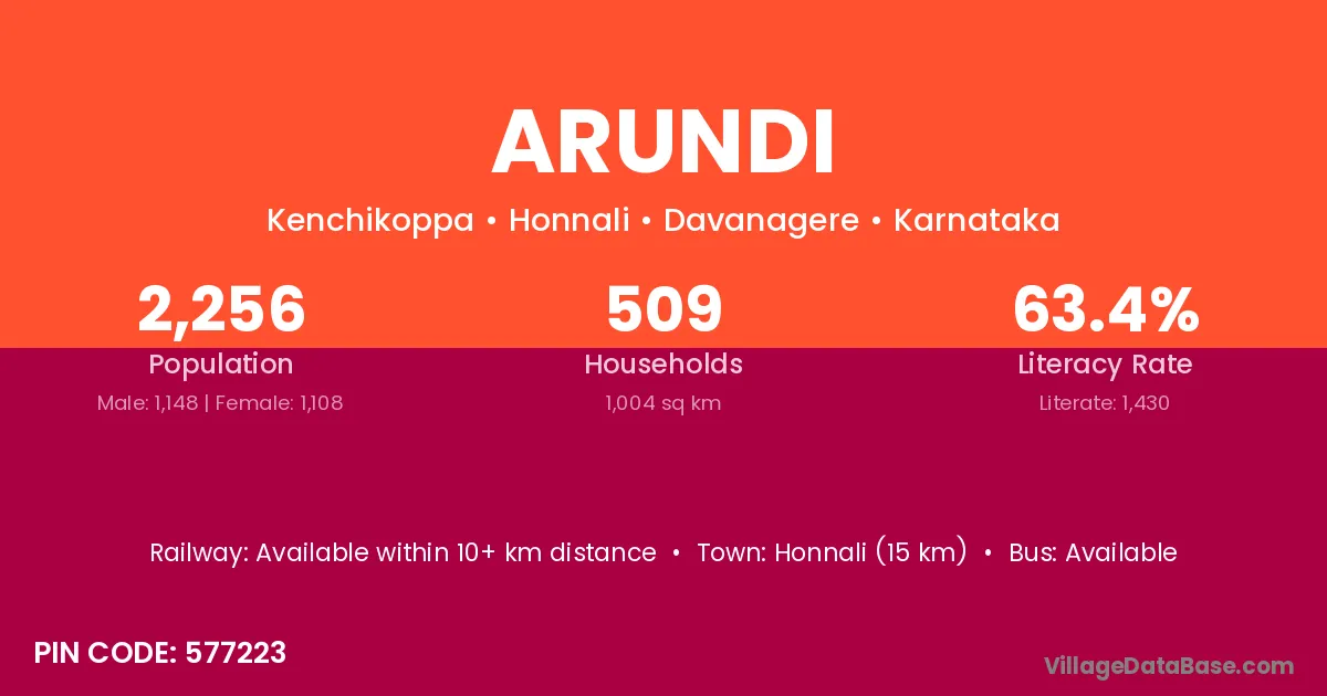 Honnali (15 km) is the nearest town to Arundi village for major economic activities and is located approximately 15 km away.