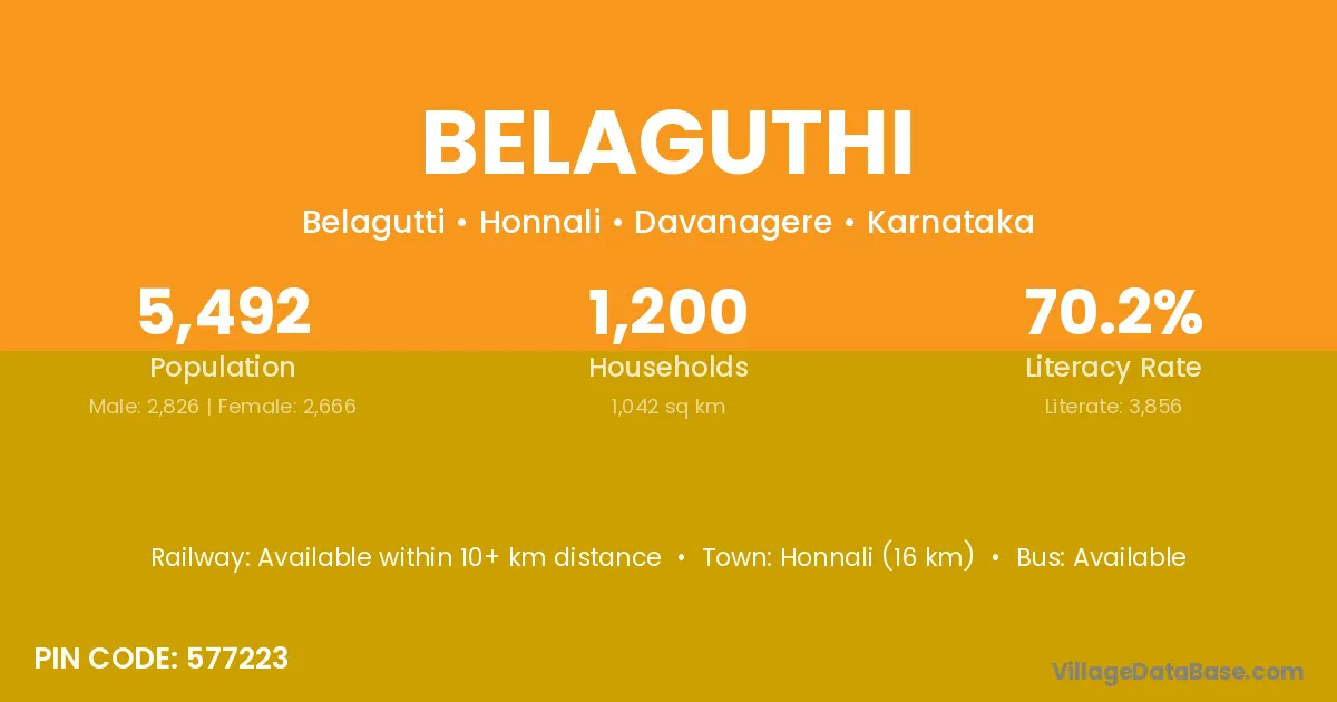 Honnali (16 km) is the nearest town to Belaguthi village for major economic activities and is located approximately 16 km away.