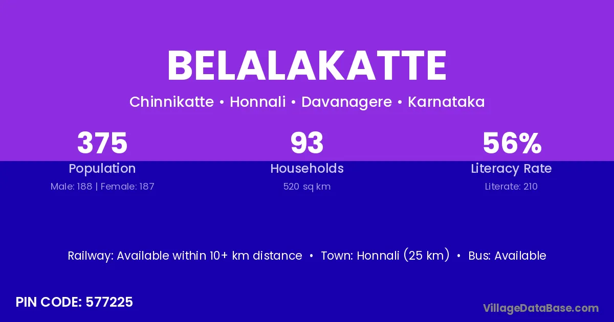 Honnali (25 km) is the nearest town to Belalakatte village for major economic activities and is located approximately 25 km away.