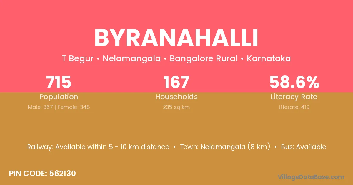 Honnali (30 km) is the nearest town to Byranahalli village for major economic activities and is located approximately 30 km away.