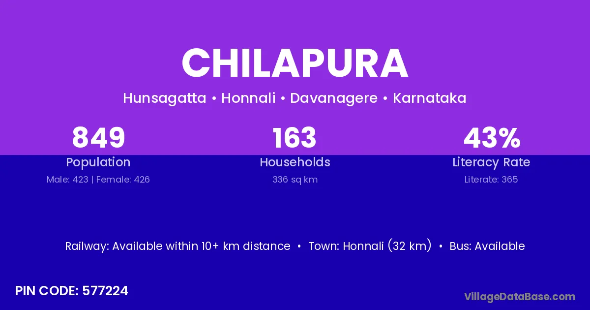 Honnali (32 km) is the nearest town to Chilapura village for major economic activities and is located approximately 32 km away.