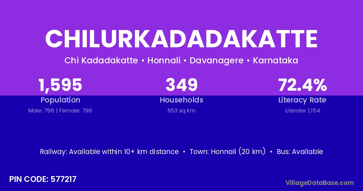 Honnali (20 km) is the nearest town to Chilurkadadakatte village for major economic activities and is located approximately 20 km away.