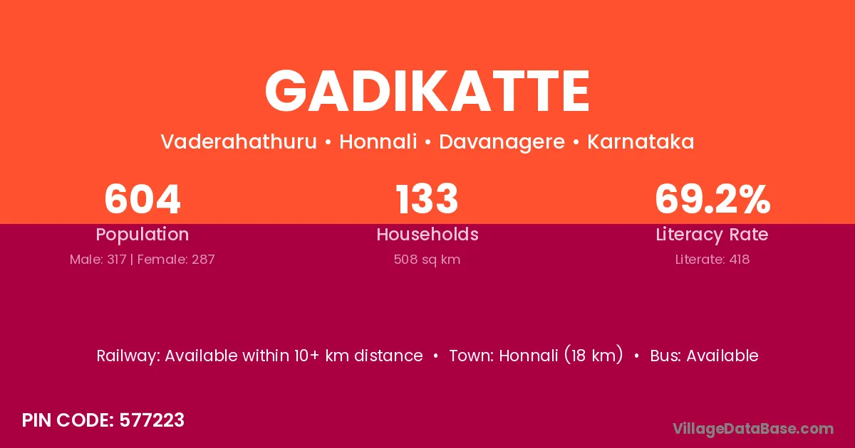 Honnali (18 km) is the nearest town to Gadikatte village for major economic activities and is located approximately 18 km away.