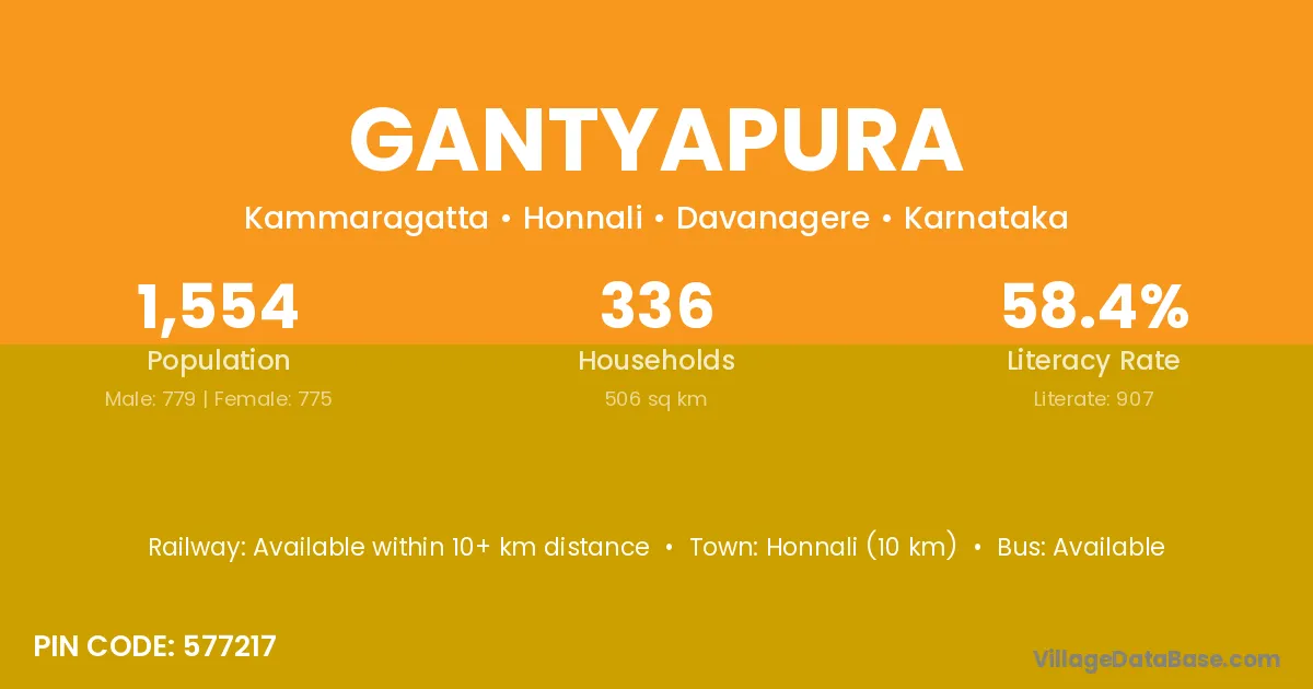 Honnali (10 km) is the nearest town to Gantyapura village for major economic activities and is located approximately 10 km away.