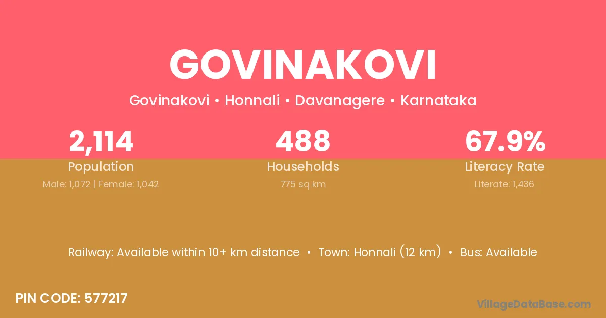Honnali (12 km) is the nearest town to Govinakovi village for major economic activities and is located approximately 12 km away.