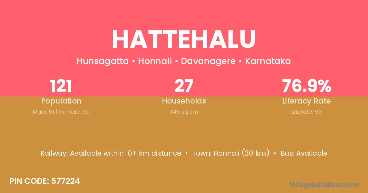 Hattehalu village has a total population of 121 people, of which 61 are males and 60 are females.