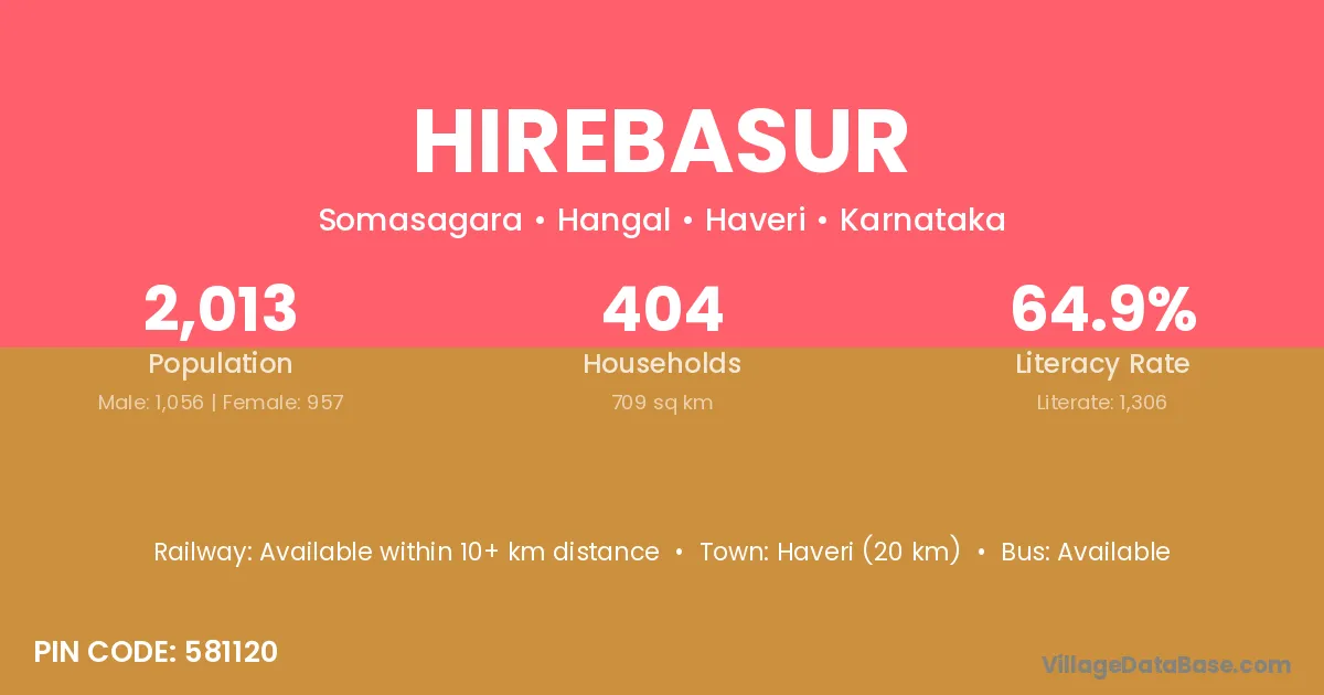 Honnali (21 km) is the nearest town to Hirebasur village for major economic activities and is located approximately 21 km away.