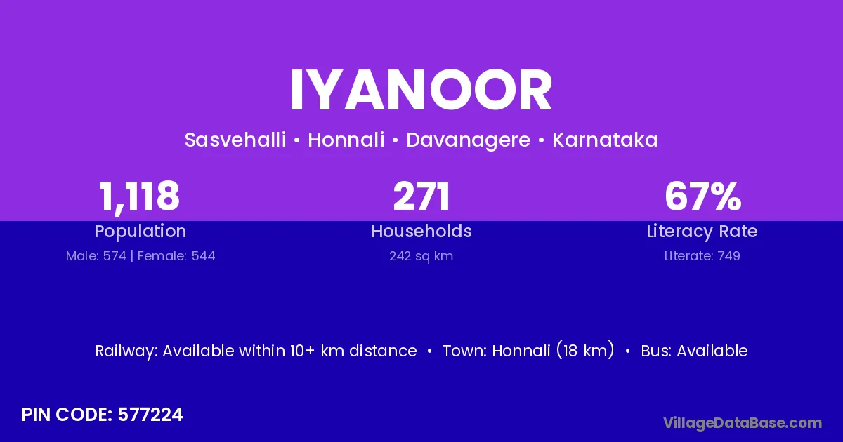 Honnali (18 km) is the nearest town to Iyanoor village for major economic activities and is located approximately 18 km away.