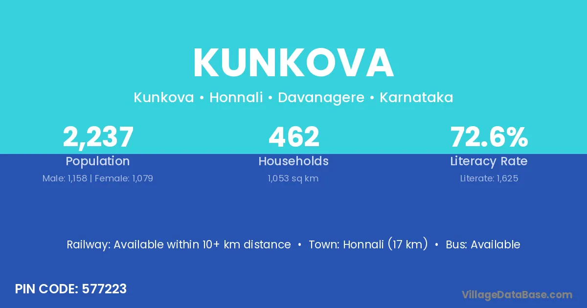Honnali (17 km) is the nearest town to Kunkova village for major economic activities and is located approximately 17 km away.