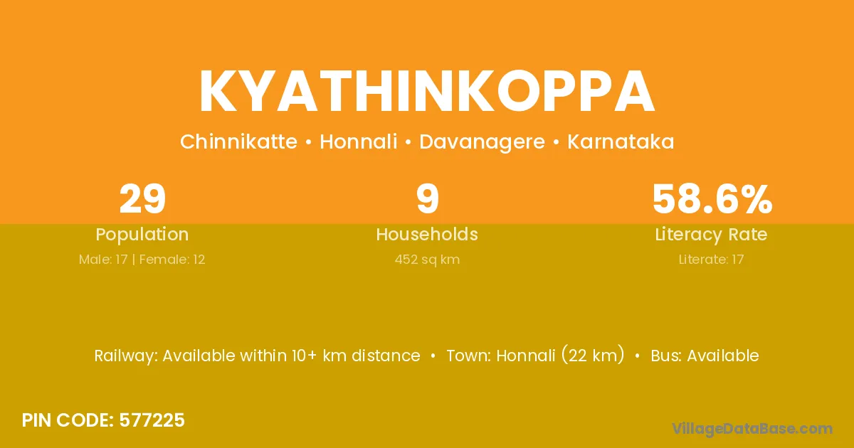 Kyathinkoppa village has a total population of 29 people, of which 17 are males and 12 are females.
