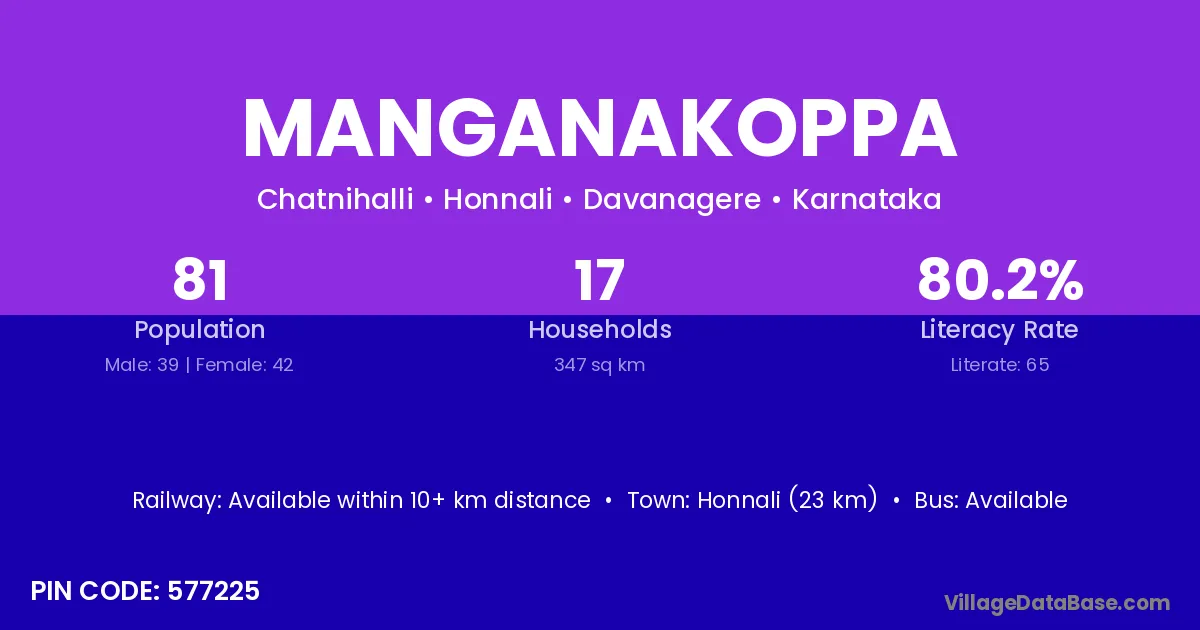 Manganakoppa village has a total population of 81 people, of which 39 are males and 42 are females.