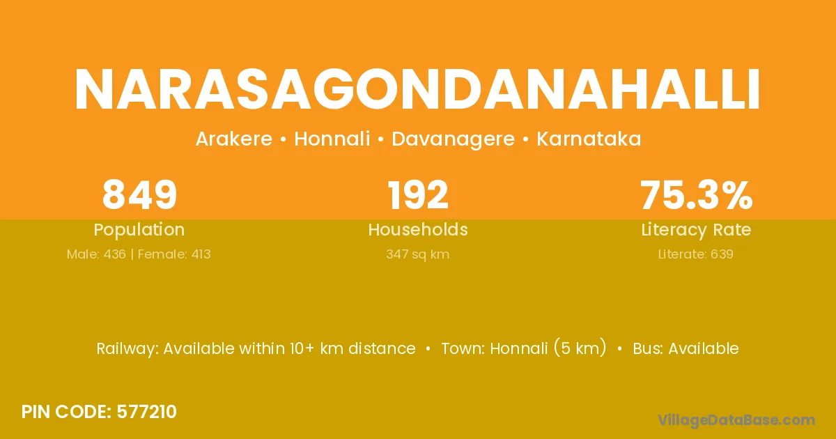 Honnali (5 km) is the nearest town to Narasagondanahalli village for major economic activities and is located approximately 5 km away.