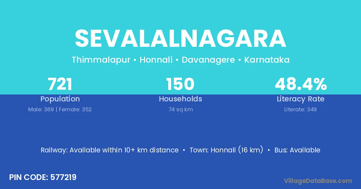 Honnali (16 km) is the nearest town to Sevalalnagara village for major economic activities and is located approximately 16 km away.