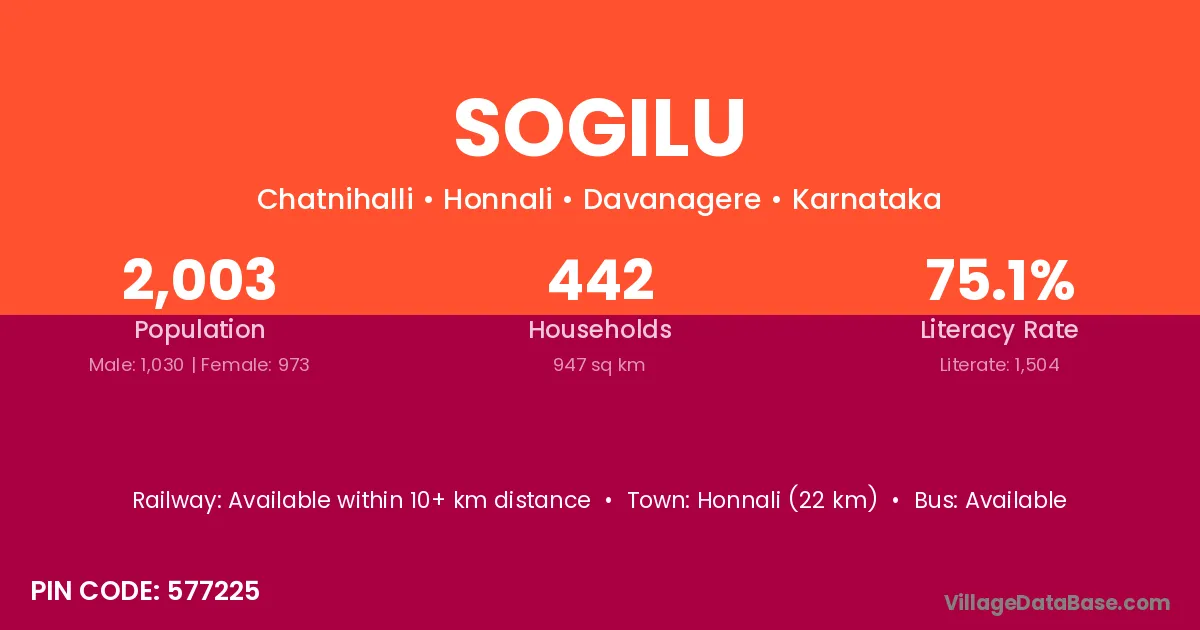 Honnali (22 km) is the nearest town to Sogilu village for major economic activities and is located approximately 22 km away.