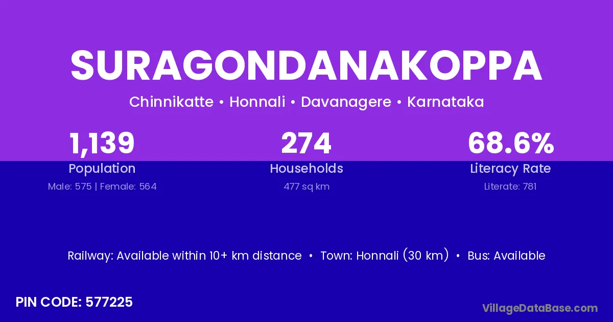 Suragondanakoppa village has a total population of 1,139 people, of which 575 are males and 564 are females.