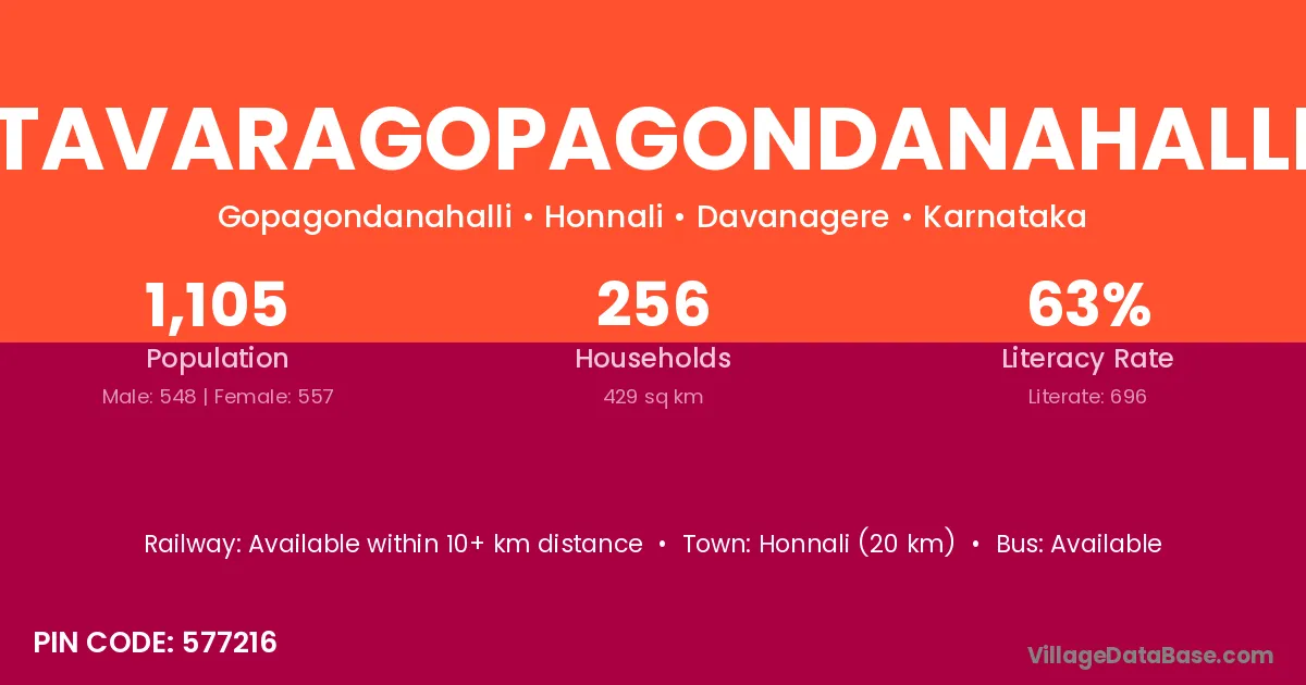 Honnali (20 km) is the nearest town to Tavaragopagondanahalli village for major economic activities and is located approximately 20 km away.