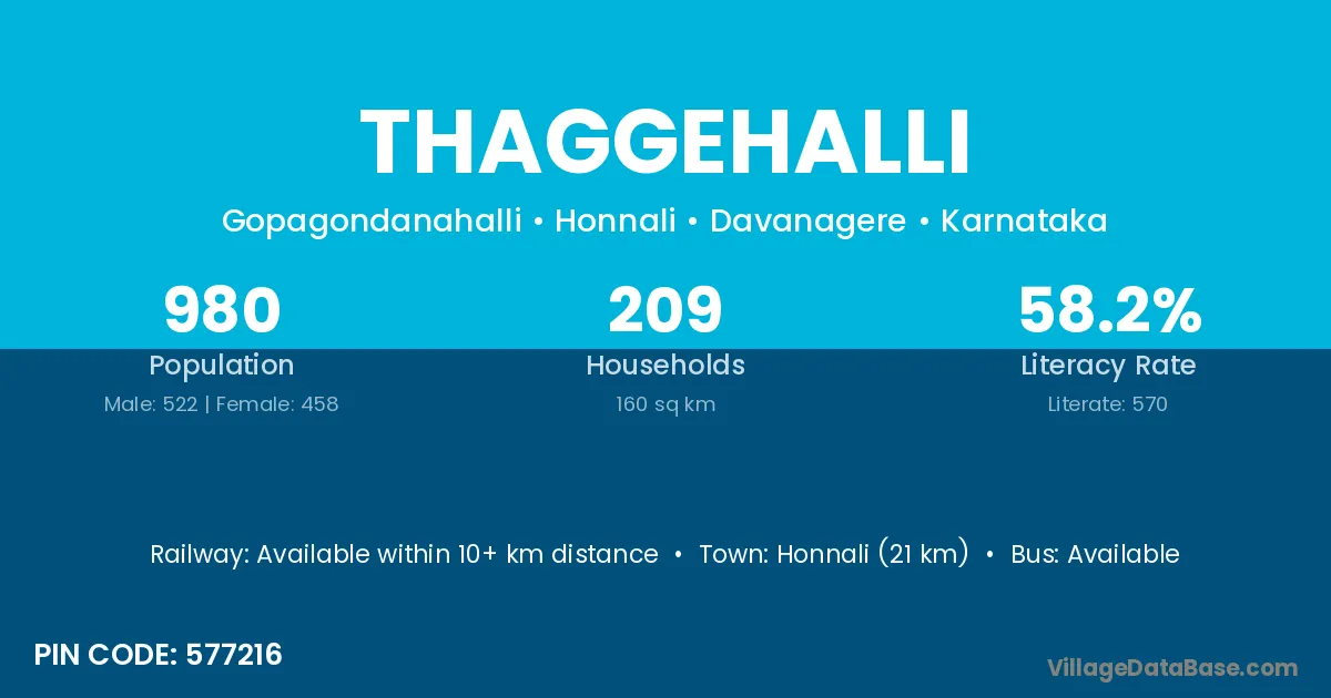 Honnali (21 km) is the nearest town to Thaggehalli village for major economic activities and is located approximately 21 km away.