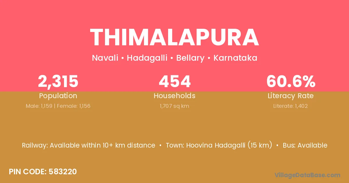 Honnali (16 km) is the nearest town to Thimalapura village for major economic activities and is located approximately 16 km away.