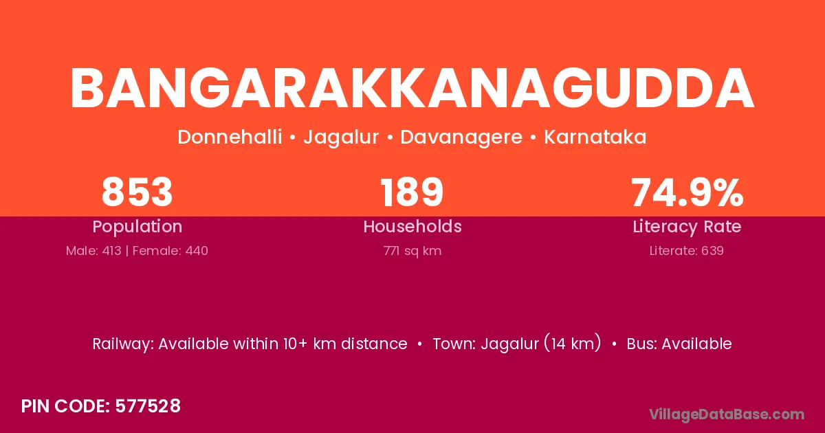 Bangarakkanagudda village has a total population of 853 people, of which 413 are males and 440 are females.