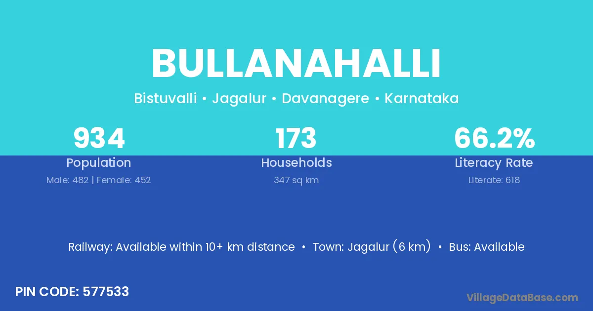 Jagalur (6 km) is the nearest town to Bullanahalli village for major economic activities and is located approximately 6 km away.