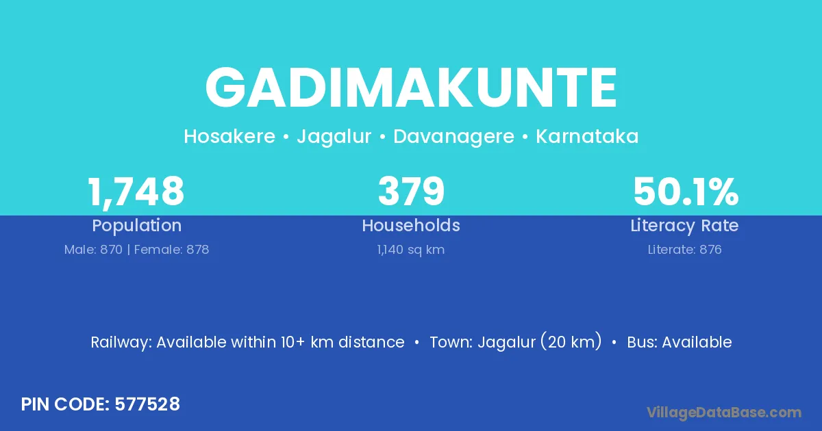 Jagalur (20 km) is the nearest town to Gadimakunte village for major economic activities and is located approximately 20 km away.