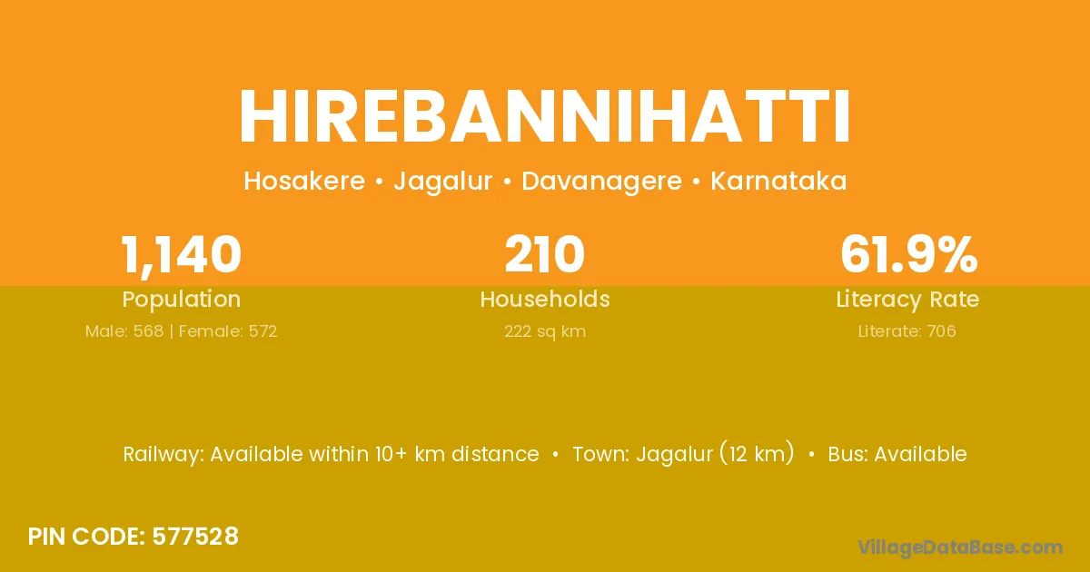 Jagalur (12 km) is the nearest town to Hirebannihatti village for major economic activities and is located approximately 12 km away.