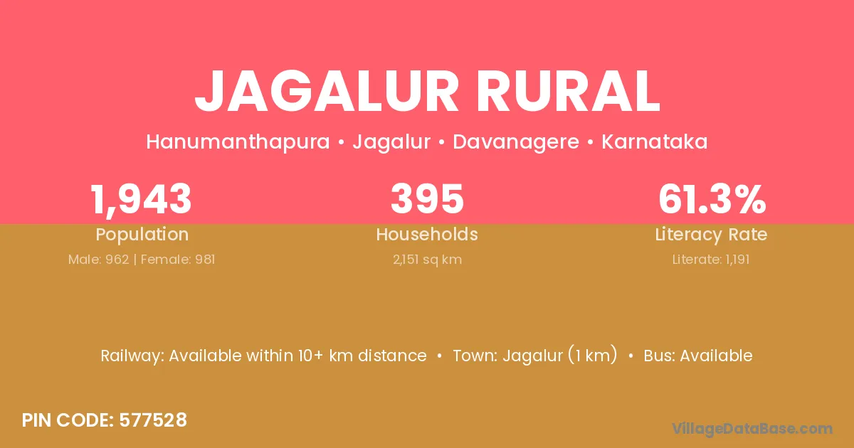 Jagalur (1 km) is the nearest town to Jagalur Rural village for major economic activities and is located approximately 1 km away.