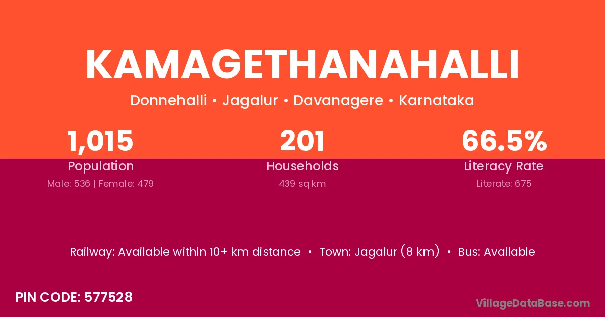 Jagalur (8 km) is the nearest town to Kamagethanahalli village for major economic activities and is located approximately 8 km away.